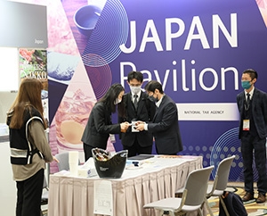 Arrive Sake Gold (Junmai Daiginjo) demonstrated by TANAKA Shuzoten Inc. (Japan), an exhibitor at the Japan pavilion, is a rare vegan-certified Japanese sake. It is made with luxurious Yamada-Nishiki, the highest grade of sake rice produced in Hyogo Prefecture. The sake has a gentle and full-bodied ginjo aroma; Katsuya Syuzo Partnership Company (Japan) of Fukuoka pavilion presents Honoka sake, light and easy-to-drink, meeting the needs of young people and women who prefer a light taste.