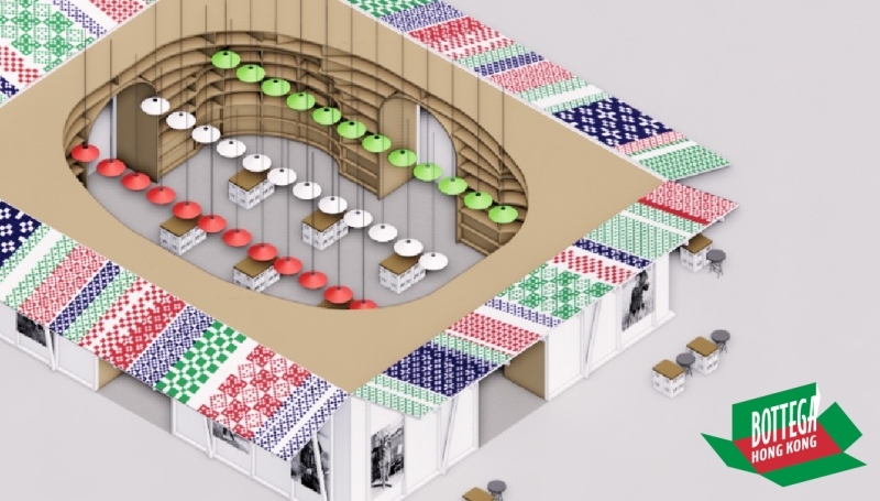 Inside the installation, Hong Kong's iconic Red A lampshades have been given a fresh look, painted in the red, white and green hues of the Italian flag and plastic crates once used for soft drink bottles have been transformed into transparent display stands.