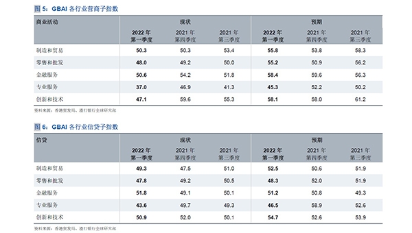在各行业营商子指数中,"制造和贸易"现状指数与上季度相同,其他行业的现状子指数均环比下降(图5及图6)。当中以往经常名列前茅的"创新和技术"指数降幅最大,从去年第四季的59.6下降至47.1,反映近期监管收紧带来的打击,仅超出录得37的"专业服务"。而"专业服务"和"金融服务"现状指数分别下降9.9点和3.6点,反映内地表现低迷的房地产市场以及因新冠疫情而出现季度收缩的香港。然而金融企业仍是最乐观的一组,现状指数为高于盛衰分界线的50.6。预期指数方面,外部需求似乎在第一季度支撑了制造业的表现,令制造企业的预期指数环比增长2点达55.8,但在严格新冠遏制措施干扰生产的情况下,或为制造企业带来压力。虽然"创新和技术"行业现状指数令人失望,但预期指数却高达58.1,仅次于"金融服务"的58.4,反映近期的监管逆风并没有带来持续的负面效应。